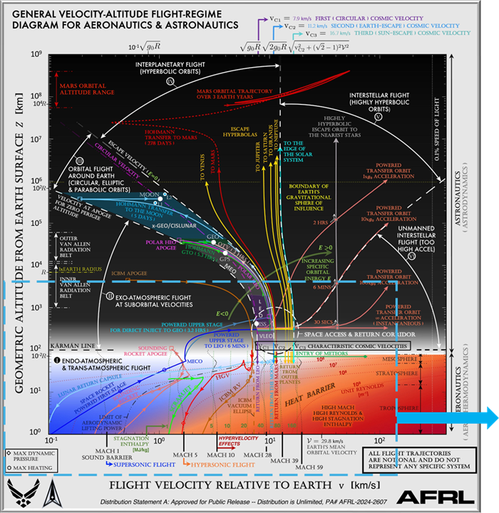 Reference : Urzay, J. (2025). "General Velocity-Altitude Flight-Regime Diagram for Aeronautics and Astronautics". Journal of Spacecraft and Rockets, 62(2), 692-695.